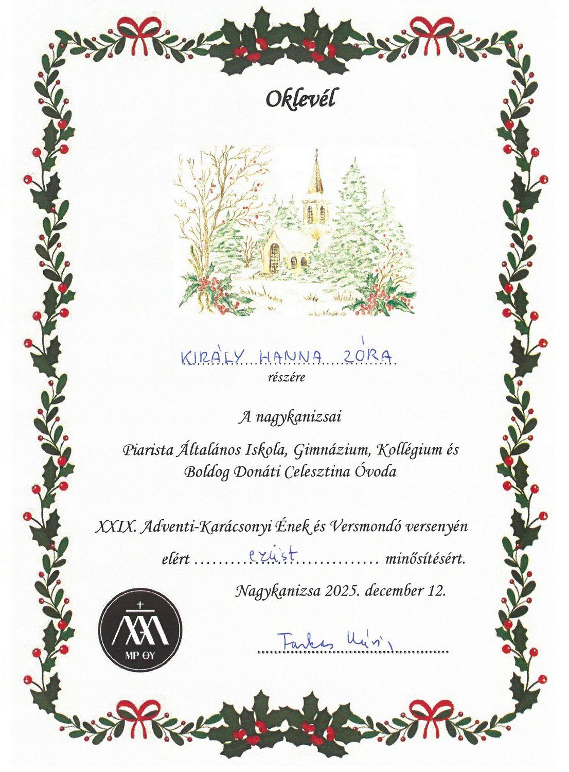 Aktualitások Adventi - Karácsonyi Ének- és Versmondó Verseny 2025. december 18., csütörtök @ 12:27 Az ünnepekre való hangolódás a versek erejével a nagykanizsai Piarista Általános Iskola, Gimnázium, Kollégium és Boldog Donáti Celesztina Óvoda által meghirdeti hagyományos Adventi - Karácsonyi Ének- és Versmondó Versenyén. Kapcsolódó galéria Megosztás