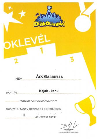 A Kajak - kenu korcsoportos diákolimpia 2018/2019. tanévi országos döntőjében Ács Gabriella 12.C osztályos tanuló II. helyezést ért el.