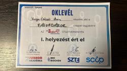 A másik verseny Szegeden volt 2025. november 27-én, melyet a Junior Innovátorok címmel szerveztek. Egy előzetes pályamunka alapján került be iskolánk végzős tanulója. A helyszínen rövid ismerkedés után csapatokba osztották a továbbjutókat, akiket egy mentor segítette a nap során. Anna csapatának egy adott problémára - jelen esetben a bakteriofágok fontosságára - kellett kitalálni egy megvalósítható megoldást, majd 3 percben kellett előadni, amit egyik csapattársával mutatott be. Ezt követte egy 10-15 perces vita a zsűrivel. A zsűri tagjai Dr. habil. Újvári Edit (a szegedi Junior Akadémiától), prof. Dr. Badó András (szintén a szegedi Junior Akadémiától) és Dr. Horváth Péter (a SZBK Biokémiai Intézettől) voltak. A nap koordinálását Dr. Papp Benjámin Tamás vezette a SCUP csapatából. Anna nagyon jól érezte magát ezen a versenyen is, mely során egy nagyon nyitott csapattal volt lehetősége együtt dolgozni, és végül győztesként együtt megnyerniük a versenyt.