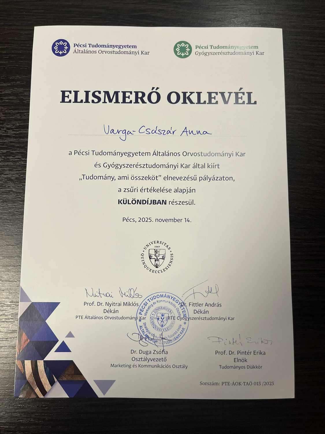 Az egyik a „Tudomány, ami összeköt” elnevezésű, a Pécsi Tudományegyetem által szervezett verseny. A vállalkozó kedvű diákoknak hét téma közül lehetett választani, Anna az „Ember maradni – az empátia szerepe az orvosi hivatásban” címmel készítette el dolgozatát.