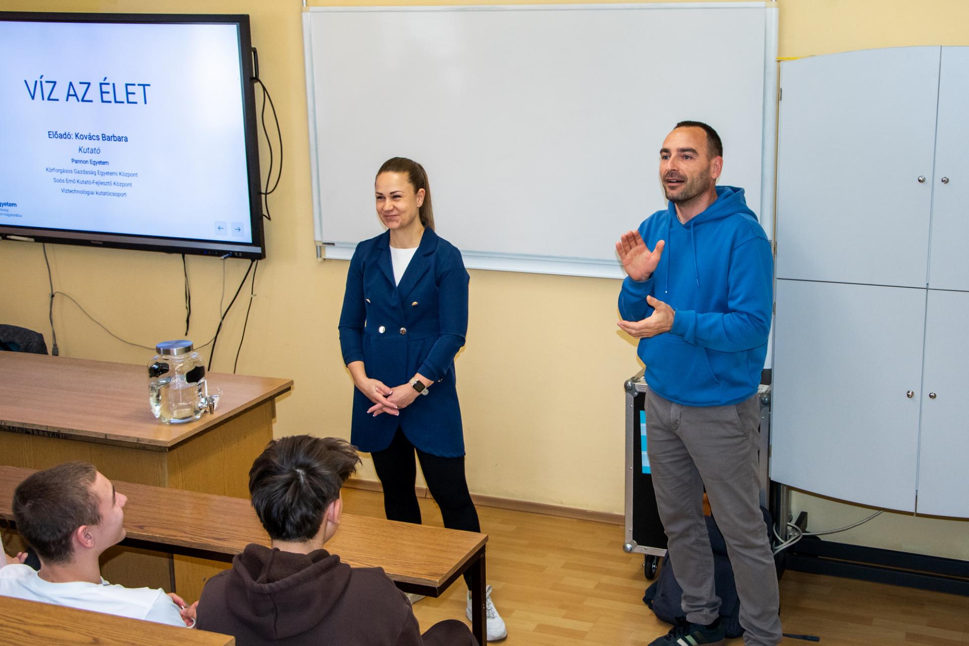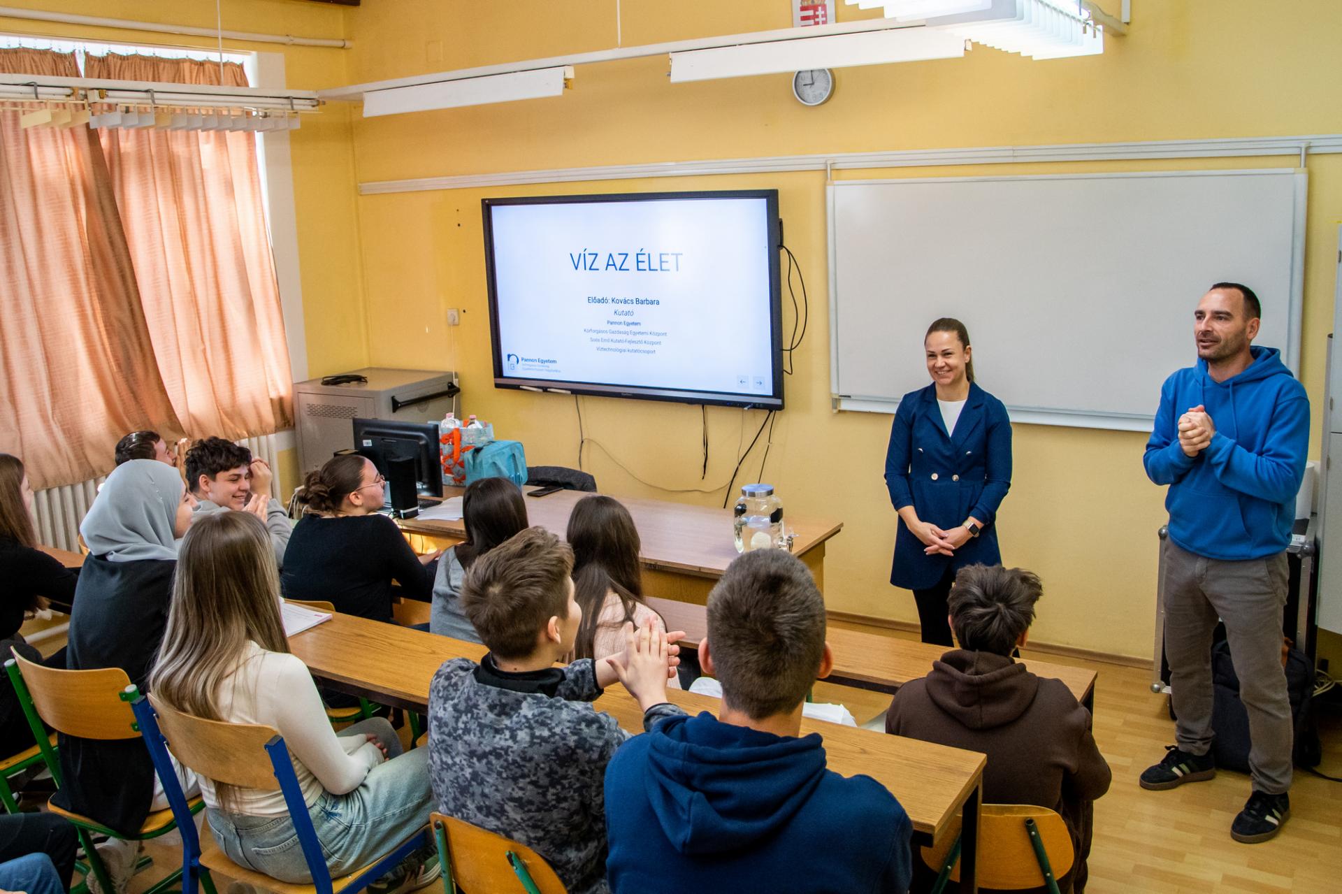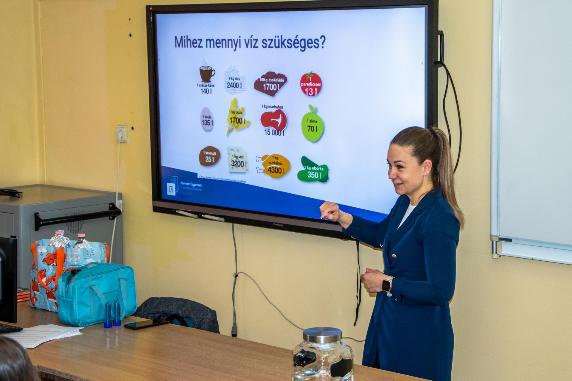A közismereti előadóban Kovács Barbara, a Pannon Egyetem Körforgásos Gazdaság Egyetemi Központ munkatársa és iskolánk egykori diákja előadásában hallhattak tanulóink a világnap idei témájával kapcsolatos érdekes és olykor meghökkentő tényeket, valamint egy vízkostoláson is részt vehettek.
